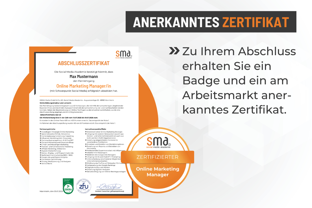 Diese Weiterbildung an der Social Media Akademie richtet sich an alle, die ihre Kenntnisse im Online-Marketing erweitern und sich dabei gezielt auf Social Media spezialisieren möchten. Du wirst umfassend in die wichtigsten Social Media Plattformen eingeführt und lernst, wie du sie strategisch für Marketingzwecke nutzt. Mit Modulen wie Suchmaschinenmarketing, Conversion-Optimierung und Mobile-Marketing wirst du auf die Anforderungen der Branche vorbereitet. Ein besonderer Fokus liegt auf praxisorientierten Themen wie der Erstellung von Facebook-Werbekampagnen oder dem Design beeindruckender Social Media Bilder. Am Ende der Weiterbildung bist du in der Lage, erfolgreiche Kampagnen zu leiten, rechtliche Vorgaben einzuhalten und neue Technologien wie KI und ChatGPT im Marketing einzusetzen.